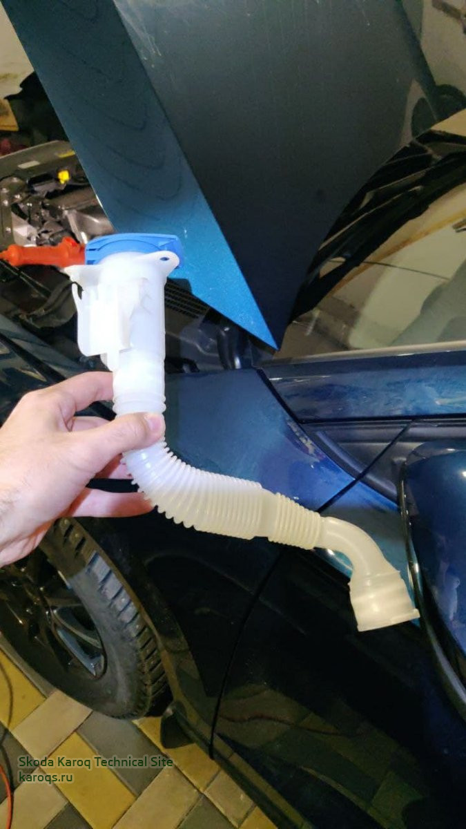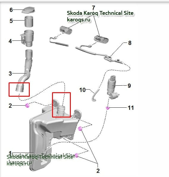 Конструкция системы стеклоомывателей Skoda Karoq, схема расположения шлангов жидкости омывателя, номера для заказа.