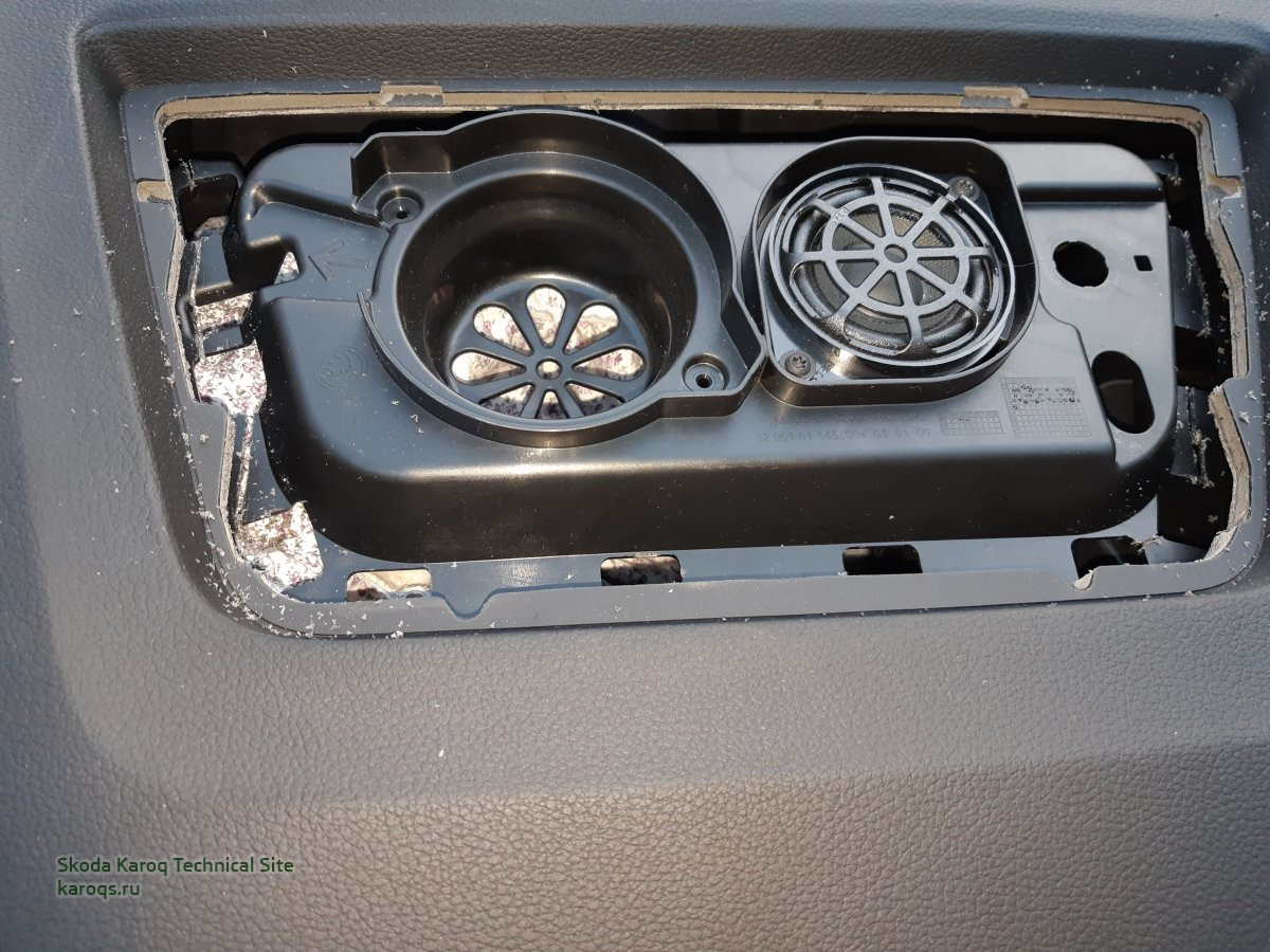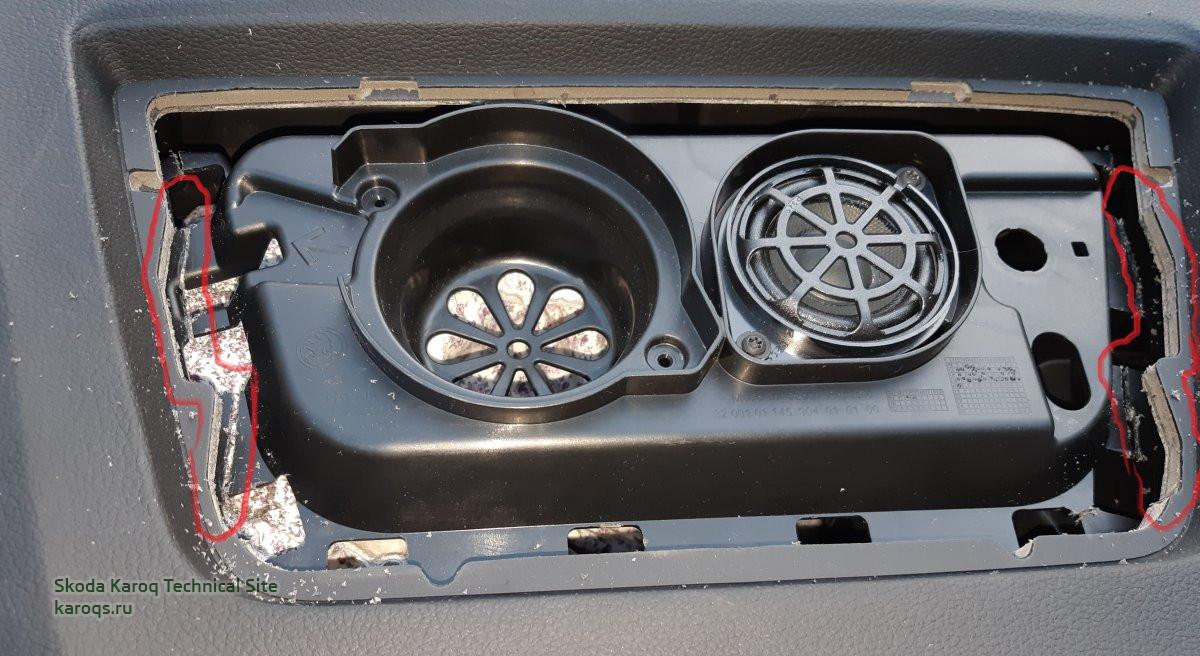 2. Под решеткой находится монтажная пластиковая панель приваренная к торпедо, на которой расположен динамик Глонас. Если у Вас в комплектации звука установлен Кантон, то на той же панели установлен второй динамик - центральный канал звука ГУ, потому для Кантона замена решетки на ящик будет неадекватным для звука решением. Откручиваем динамик Глонас, отсоединяем его разъем и убираем подальше для сохранности. Но я динамик открутил только после выпиливания панели – при аккуратном обращении не критично.