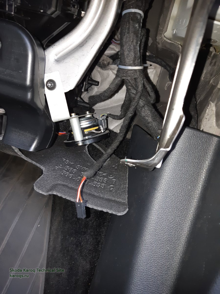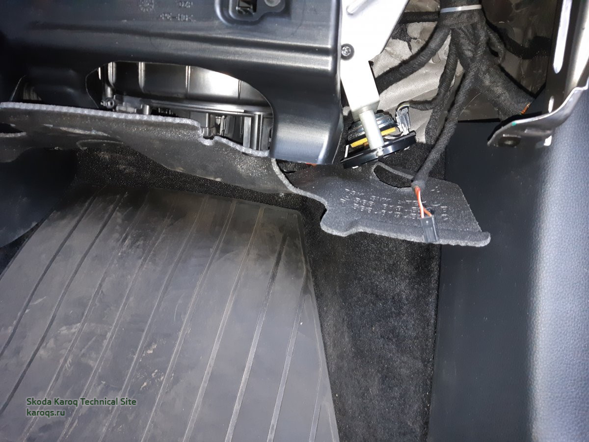 4. Динамик Глонаса перенес вниз за правую сторону бардачка. Снял бардачок, удлинил штатные провода с разъемом на динамик и прокинул по трассе в место установки динамика. Сам динамик закрепил на Г-образной металической планке через цилиндрические втулки и прикрутил планку под штатный болт крепления не помню чего, вроде бы вентилятора салона, вблизи патрубка подачи воздуха в ноги переднего пассажира. Напротив динамика вырезал небольшое отверстие в ковролиновой пылезащитной панели – слышимость нормальная. Если найдется более лучший вариант для звука – то поменяю, но пока не напрягает.