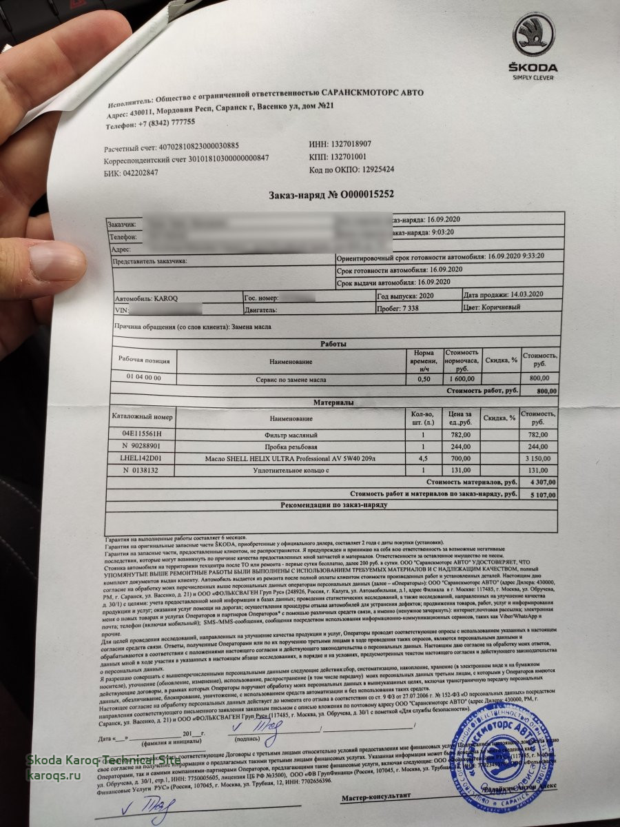 Замена масла обошлась в 5100. Акт позже приложу, в машине остался. Масло у них дорогое, конечно, есть смысл идти на замену/ТО со своим маслом. Дальше так и буду делать.